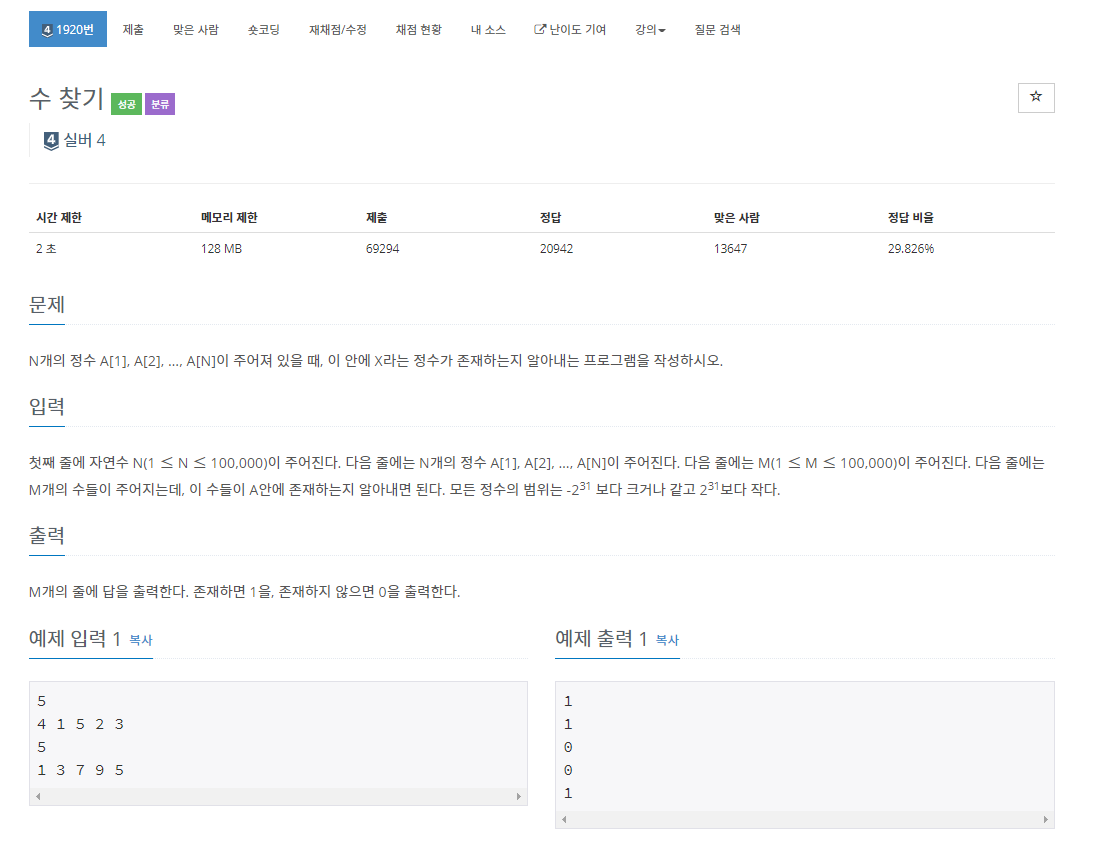 N개의 정수 A[1], A[2], …, A[N]이 주어져 있을 때, 이 안에 X라는 정수가 존재하는지 알아내는 프로그램을 작성하시오.