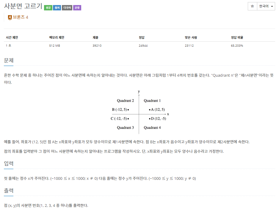 점 (x, y)의 사분면 번호(1, 2, 3, 4 중 하나)를 출력한다.