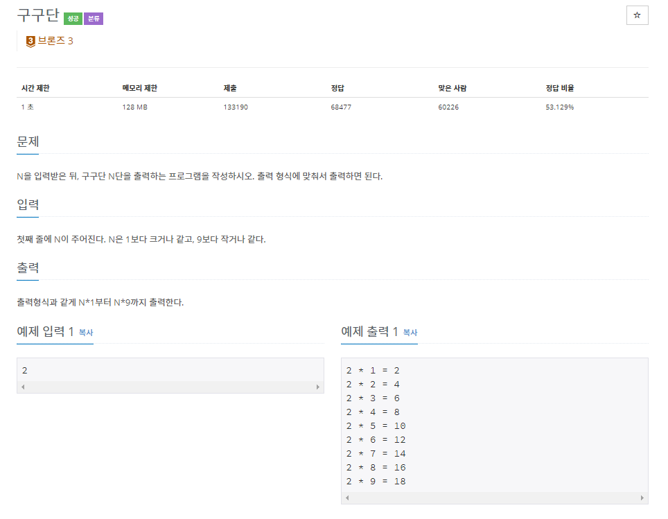 해당 문제는 입력받은 n에대해 구구단을 출력하는 문제이다. 여기서 요구하는 것은 for 혹은 while로 반복문을 사용할 수 있는가 이다. 정말 간단하게 반복문을 사용해 해결이 가능하다.