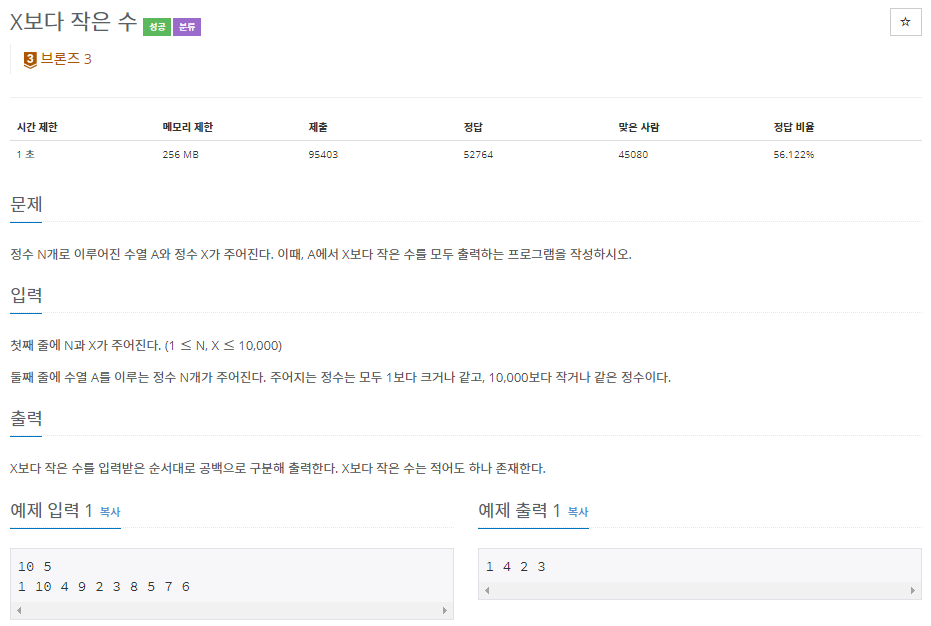 X보다 작은 수를 입력받은 순서대로 공백으로 구분해 출력한다. X보다 작은 수는 적어도 하나 존재한다.