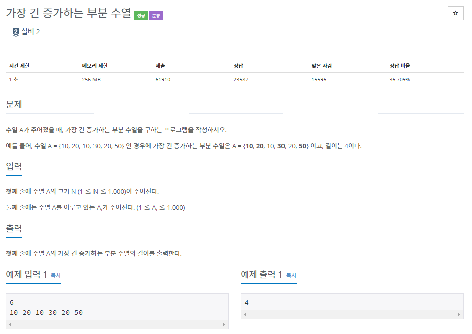 예를 들어, 수열 A = {10, 20, 10, 30, 20, 50} 인 경우에 가장 긴 증가하는 부분 수열은 A = {10, 20, 10, 30, 20, 50} 이고, 길이는 4이다.
