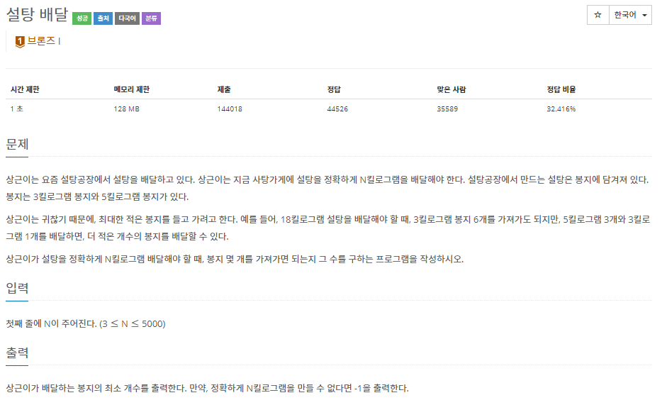 상근이는 귀찮기 때문에, 최대한 적은 봉지를 들고 가려고 한다. 예를 들어, 18킬로그램 설탕을 배달해야 할 때, 3킬로그램 봉지 6개를 가져가도 되지만, 5킬로그램 3개와 3킬로그램 1개를 배달하면, 더 적은 개수의 봉지를 배달할 수 있다.