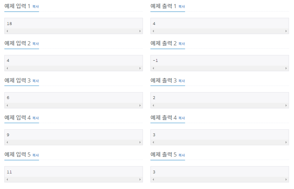 상근이가 배달하는 봉지의 최소 개수를 출력한다. 만약, 정확하게 N킬로그램을 만들 수 없다면 -1을 출력한다.