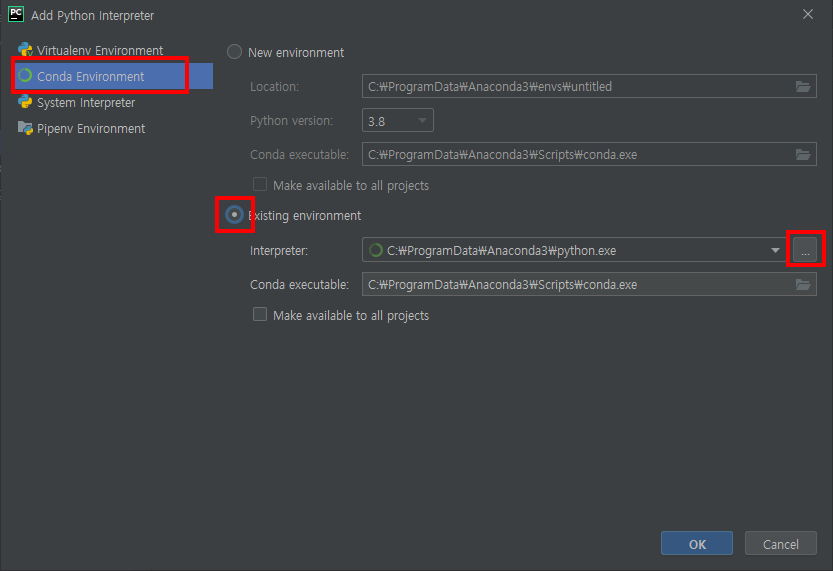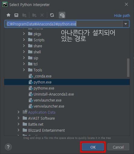 설치되어있는 아나콘다 경로의 python.exe를 선택하고 ok를 클릭합니다.