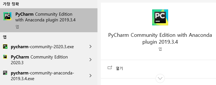 Pycharm이 설치된 것을 볼 수 있습니다.