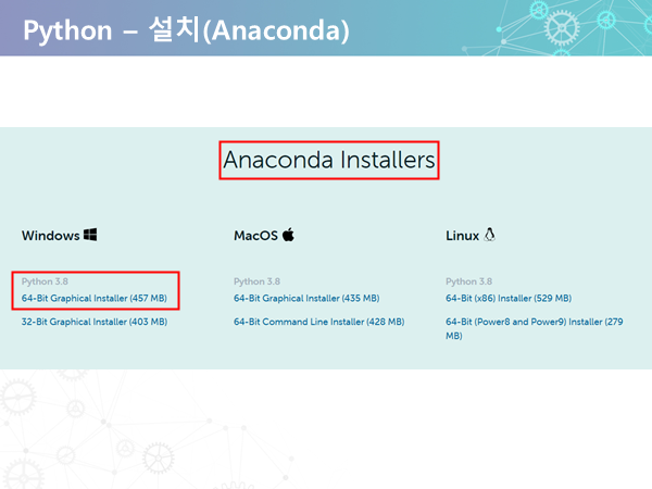 해당 링크로 들어가셔서 위 처럼 anaconda설치를 위한 인스톨러를 다운받아주세요