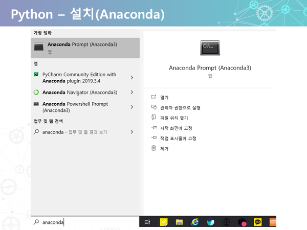 설치가 모두 완려되면 윈도우 검색으로 anaconda prompt를 검색하셔서 위 사진 처럼 설치가 잘 되었는지 확인해 보세요!