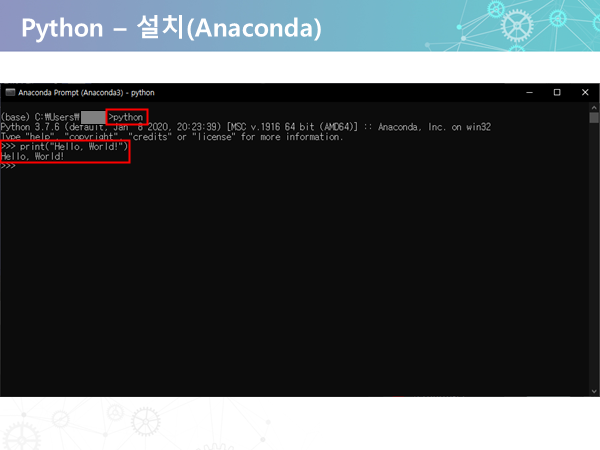 anaconda prompt를 실행하고 python를 입력하고 print("hello world")를 입력해서 위 사진처럼 출력된다면 anaconda 설치 완료입니다!