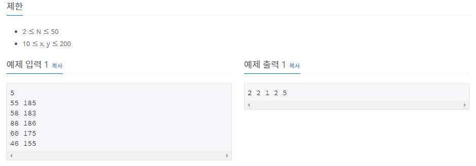 이름(몸무게, 키)덩치 등수A (55, 185) 2 B (58, 183) 2 C (88, 186) 1 D (60, 175) 2 E (46, 155) 5 위 표에서 C보다 더 큰 덩치의 사람이 없으므로 C는 1등이 된다. 그리고 A, B, D 각각의 덩치보다 큰 사람은 C뿐이므로 이들은 모두 2등이 된다. 그리고 E보다 큰 덩치는 A, B, C, D 이렇게 4명이므로 E의 덩치는 5등이 된다. 위 경우에 3등과 4등은 존재하지 않는다. 여러분은 학생 N명의 몸무게와 키가 담긴 입력을 읽어서 각 사람의 덩치 등수를 계산하여 출력해야 한다.